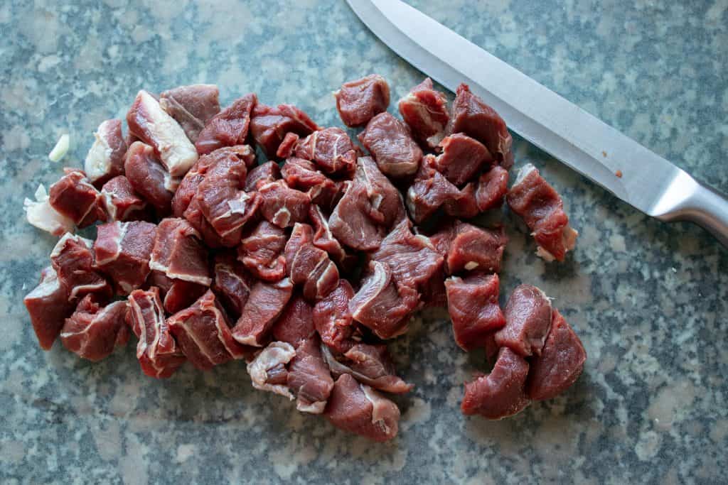 On a clean cutting board, lay out the beef and cut it into 1- 1 ½ inch cubes, going against the grain as you cut.