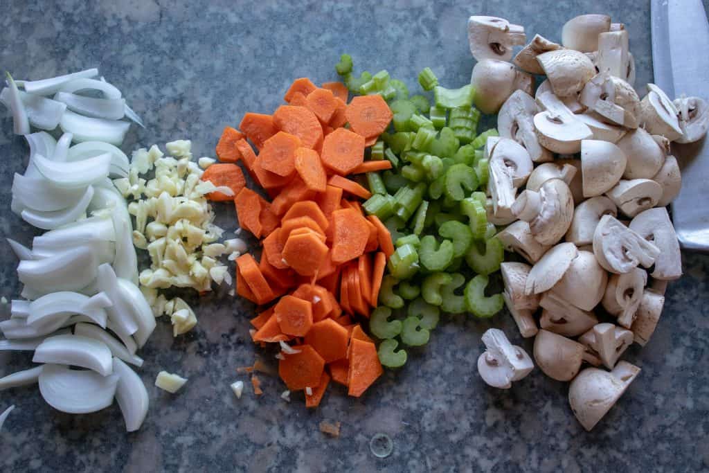 STEP TWO – CUT VEGETABLES AND MUSHROOMS