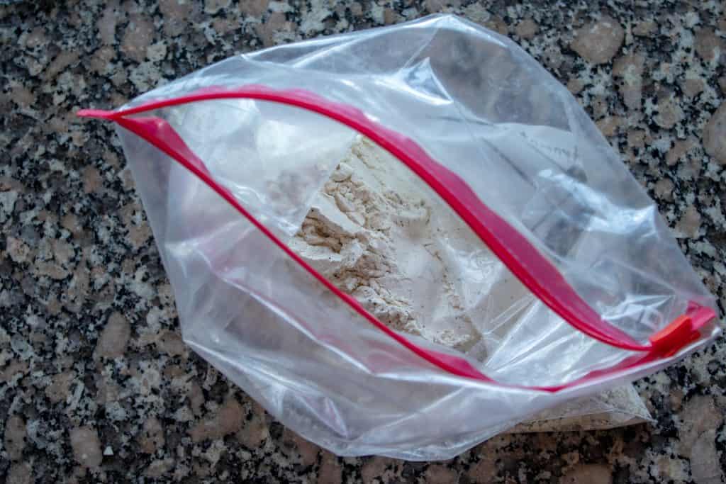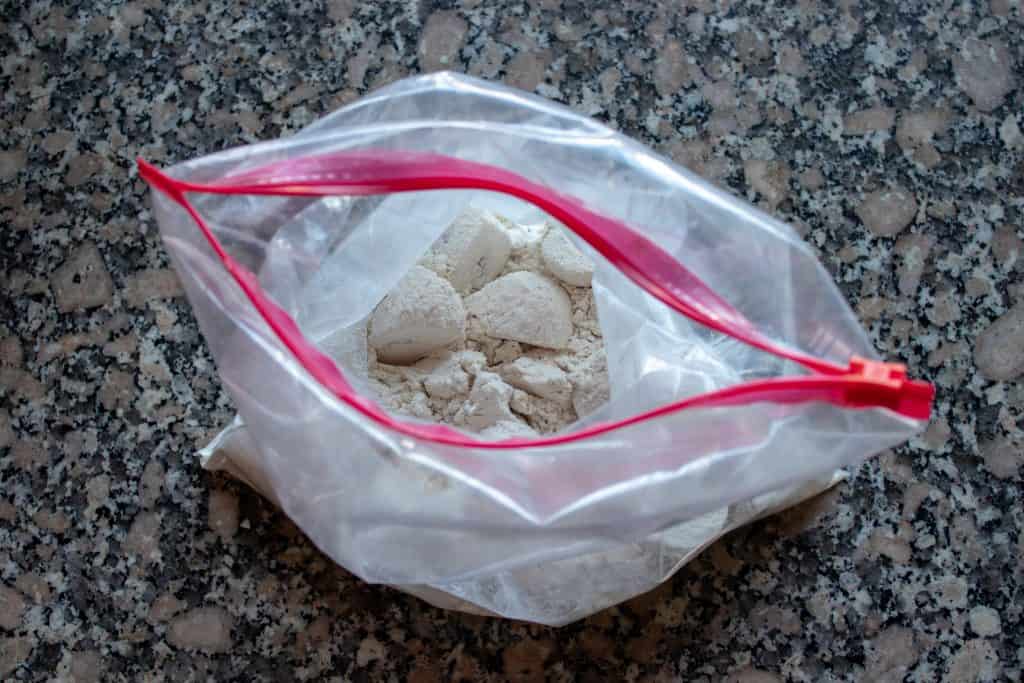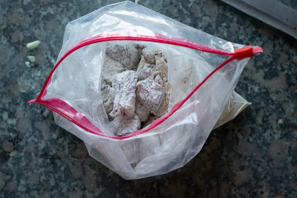 Open the bag and add all of the cut beef cubes to the bag. Seal the bag and shake well to coat the meat on all sides. Remove the meat from the bag, shaking off any excess flour back into the bag, and place it in a bowl.