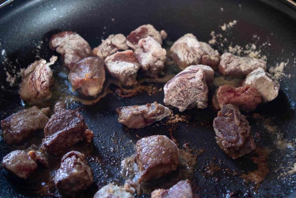 Heat 2 tablespoons of olive oil in a sauté pan over medium high heat. Add the floured beef cubes, in a single layer, to the hot pan. Brown the beef cubes on each side until all sides are browned and transfer them to a bowl while cooking the rest of the beef.