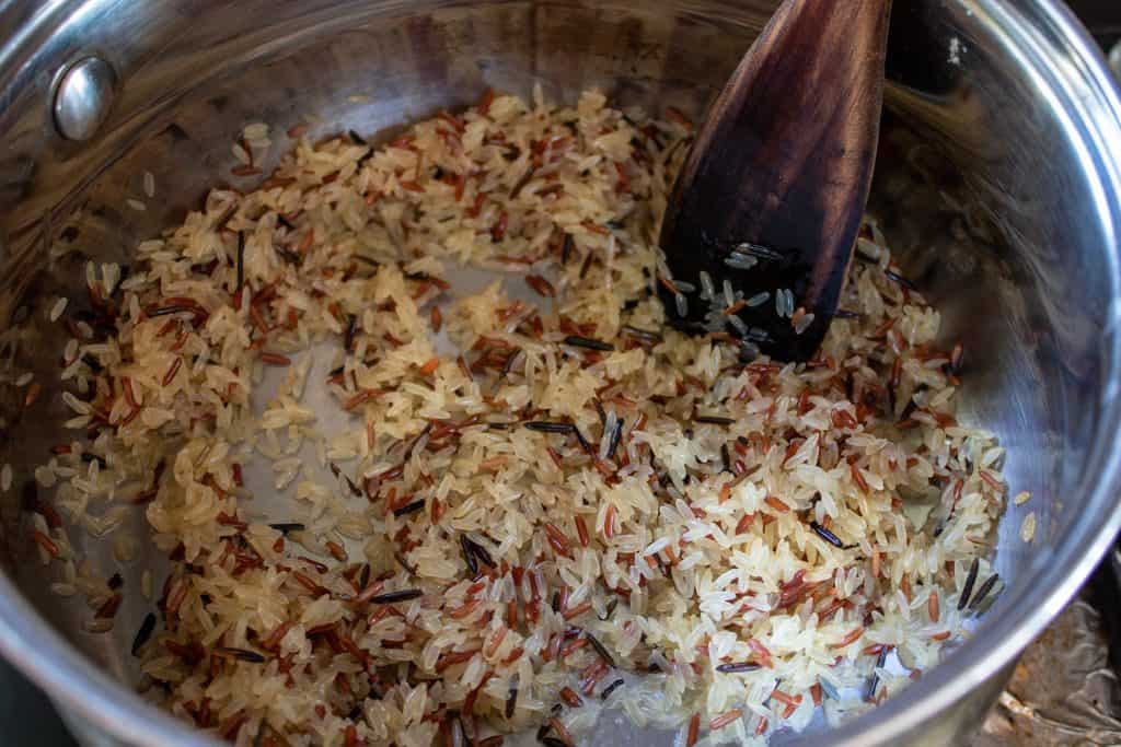 Put the butter into a medium sized saucepan and melt it over medium-low heat. After the butter has melted, add the wild rice to the pan and stir to coat it in the butter. Continue to cook the rice, stirring frequently so it doesn't stick and burn. Once the rice has become lightly toasted, browned, and smells a bit "nutty", turn off the heat.