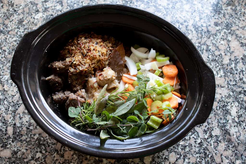 Put the browned beef and mushrooms into the slow cooker. Add the prepared vegetables and the toasted rice. Next, add the fresh herbs; rosemary, oregano, sage. Lastly sprinkle in a pinch of salt and the bay leaves into the pot.
